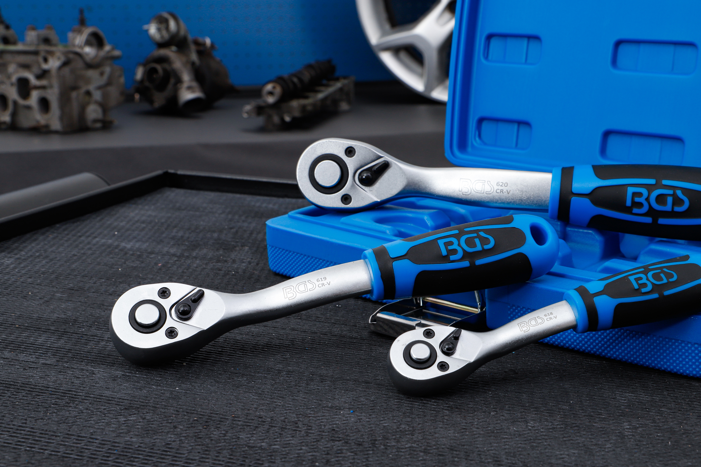 Verwenden Sie Umschaltknarren nur in Kombination mit passenden Steckschlüsseleinsätzen und achten Sie darauf, dass die Umschaltung sicher funktioniert. Tragen Sie Handschuhe, um sich vor Verletzungen durch abrutschende oder blockierte Knarren zu verletzen.
